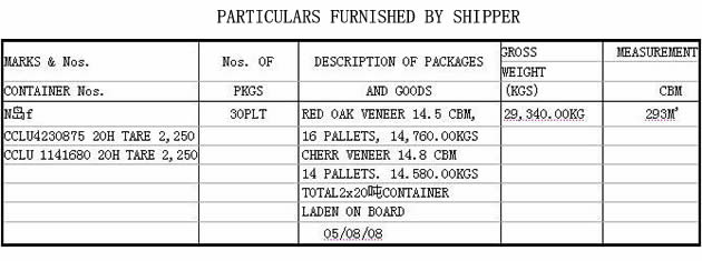 青岛富士家具有限公司(3702230523)凭手册C42185100156进口红橡木皮和樱桃木皮(分列子册4、2项,法定计量单位:千克)。运输工具于2008年8月5日申报进境,委托青岛大华物流有限公司(3702980196)于次日持入境货物通关单(编号370200104000358)和濒危物种允许进口证明书(编号2008CN/IC/l004/PH)向青岛大港海关(4227)报关。注:运保费:1800美元。