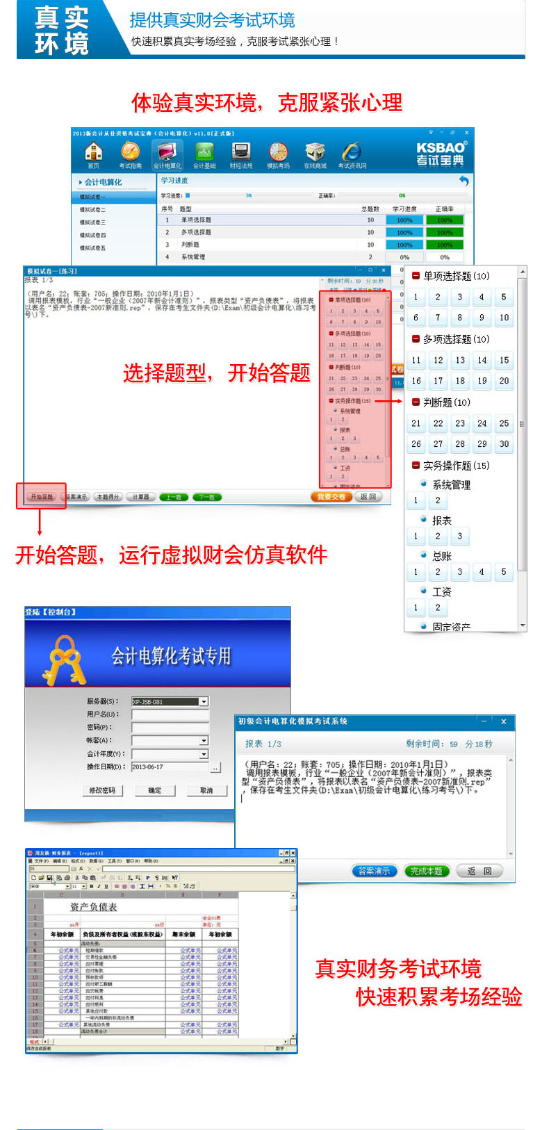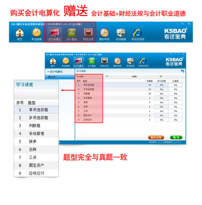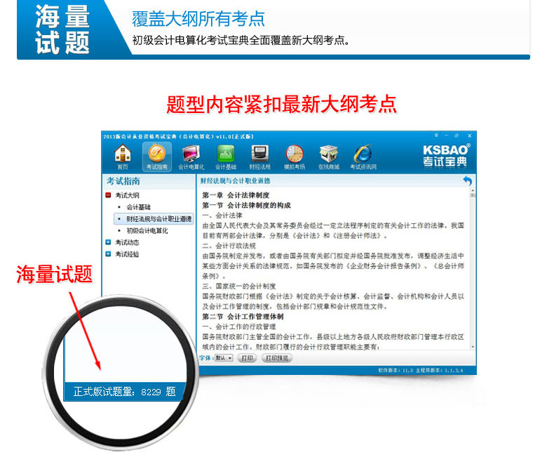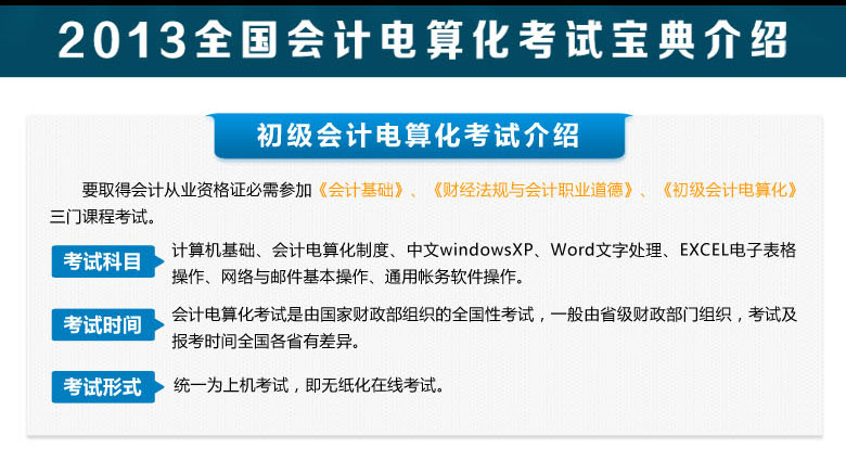 《会计从业资格考试宝典(会计电算化)用友版》系会计从业资格考试题辅导软件,适用于会计从业资格考试,软件试题库设计紧扣最新考试大纲、考试教材,符合考试题型与考试科目,复习辅导资料、考试资料丰富,免费试用、试题库巨大(注册版试题量达8千多题),辅导软件收录会计从业考试习题集、会计电算化、会计电算化随机理论题、考前押卷、历年真题,试题辅导软件囊括了目前所有的最新会计从业考试科目:会计基础、财经法规与会计职业道德、会计电算化,并提供专业级的考试宝典解题方法、答题技巧、考试要点精解。通过全面、针对性强的强化考试辅导训练、考前培训,提高您考试的应试能力,辅导您考试成功。我们免费提供考试报名时间、报名地点、报考条件、考试时间、成绩查询、合格分数线。