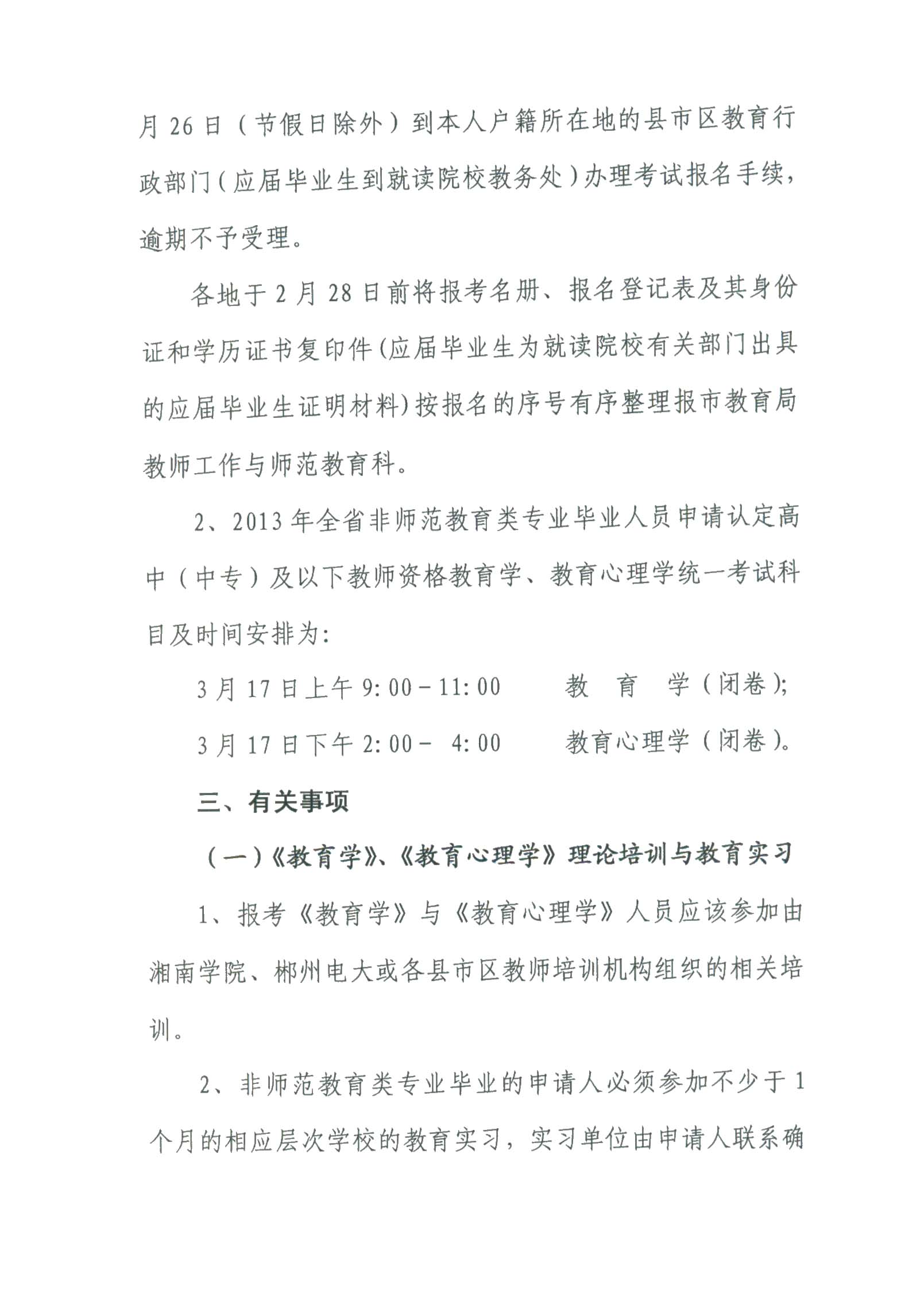郴州2013年教师资格证考试报名时间为月20日至26日