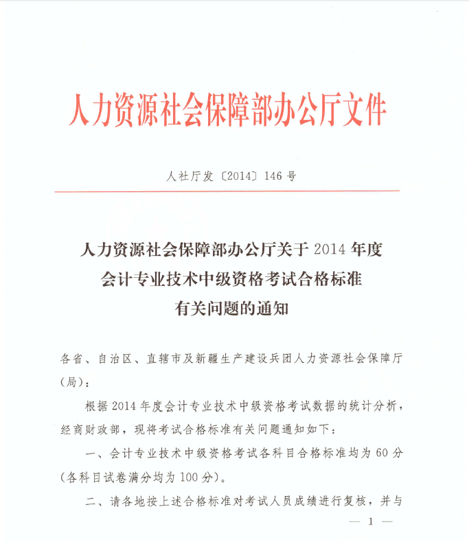人力资源社会保障部办公厅关于2014年度会计专业技术中级资格考试合格标准有关问题的通知