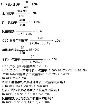 (1)计算2010年年末的流动比率、速动比率、资产负债率和权益乘数;