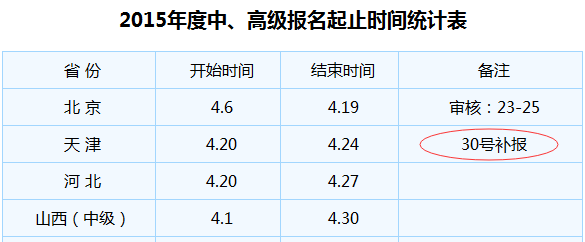 根据财政部会计资格评价中心发布的《2015年度中、高级报名起止时间统计表》,天津市2015年中级会计师考试报名时间为4月20日至24日。另安排4月30日补报名一天。